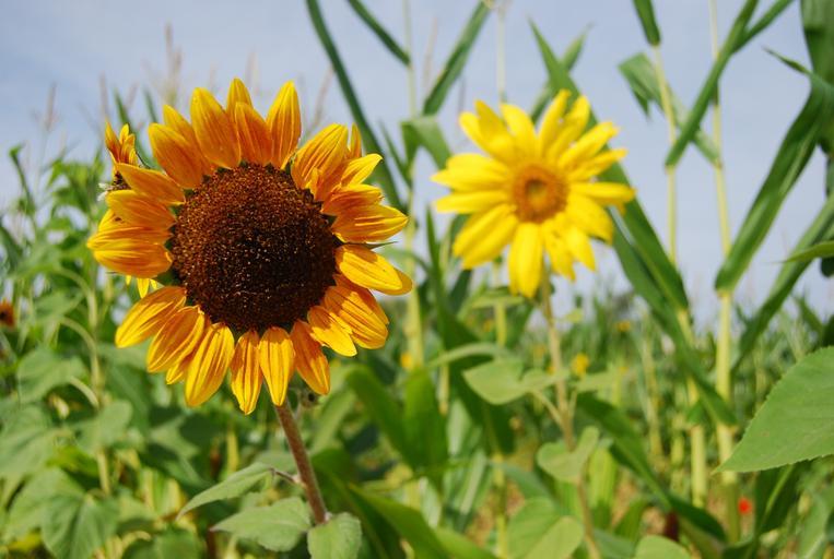 Keywords: sunflower plants flowers field fall autumn pumpkin patch october floral crop growth farm seasonal bloom blossom corn stalks farming outdoor petal sunlight natural nature yellow bright