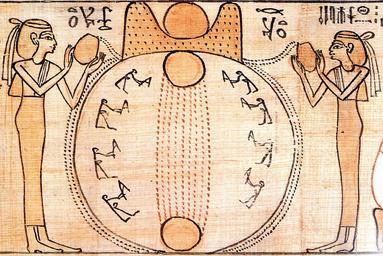 | Keywords: Sunrise at Creation.jpg en The sun rises from the mound of creation at the beginning of time The central circle represents the mound and the three orange circles are the sun in different stages of its rising At the top is the horizon hieroglyph with the sun appearing atop it At either side are the goddesses of the north and south pouring out the waters that surround the mound The eight stick figures are the gods of the Ogdoad hoeing the soil Scanned from the book Ancient Egypt edited by David P Silverman p 121; photograph from the Book of the Dead of Khensumose Original artist unknown Book published 2003; artwork made in Twenty-first Dynasty c 1075 “945 BC PD-old-100 PD-old-100 Book of the Dead Mythology in ancient Egyptian art Horizon hieroglyph |
