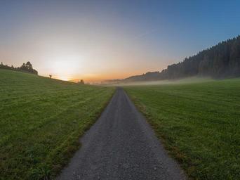 Keywords: sunrise fog path grass gravel sky sun blue green tree fisheye