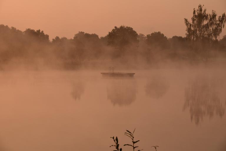Keywords: sunrise morgenrot skies sun sky dawn light nature mood mirroring lake trees fog beautiful romantic web raft island mourning farewell melancholy