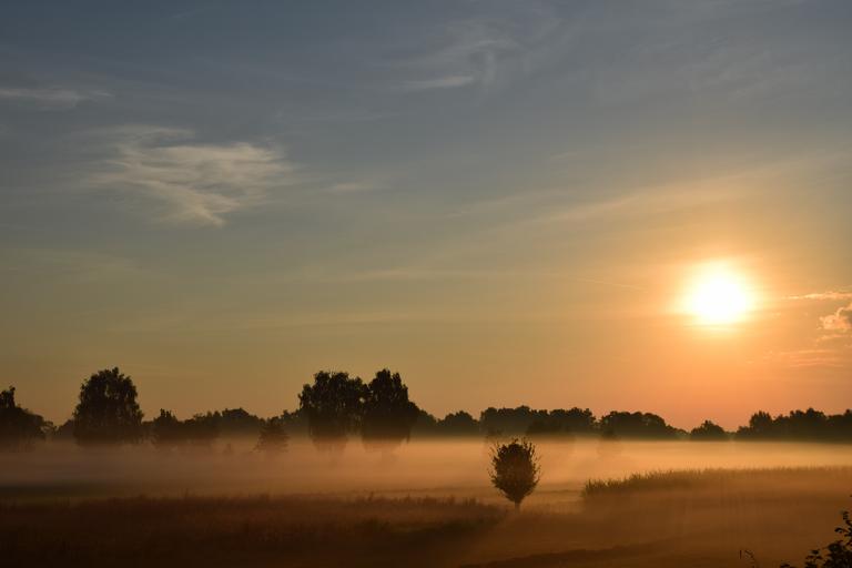 Keywords: sunrise morning mist haze sun fog trees landscape nature mood quiet start of day morning day new day beginning red morgenrot romantic morgenstimmung mysthisch rural