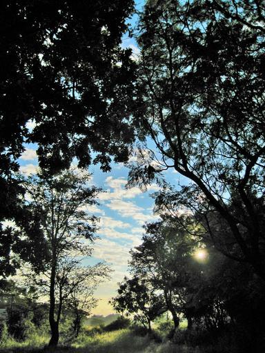 Keywords: sunrise sun rising bright sky blue trees secluded veld