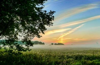 Keywords: sunrise sun sunbeam skies morgenrot meadow fog landscape
