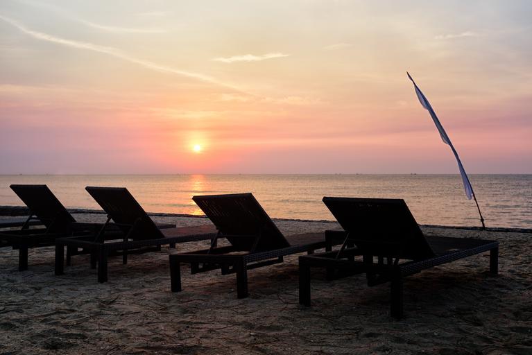 Keywords: sunrise thailand beach chairs lounge sky tranquil water sea ocean vacation thai tropical sun travel outdoor tourism