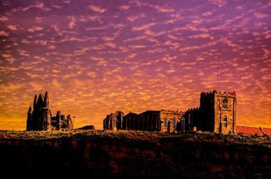 Keywords: sunset abbey sky fire red yellow weather architecture england whitby old mystical evening