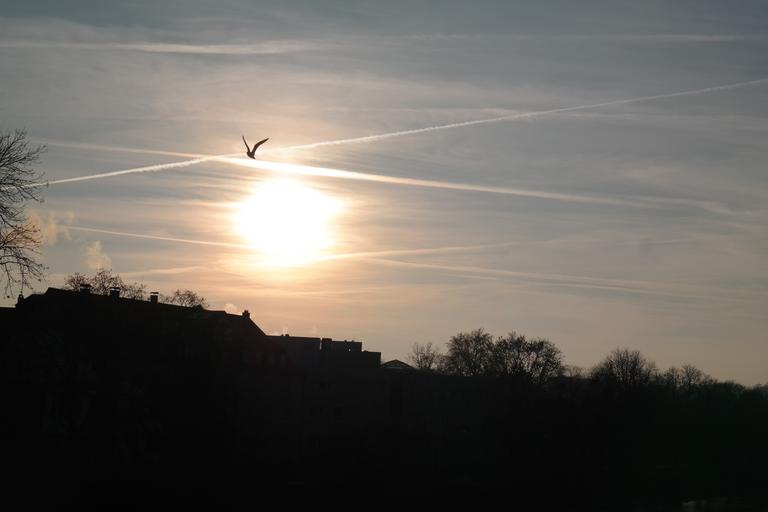 Keywords: sunset birds fly contrail sun sky clouds golden sparkle abendstimmung