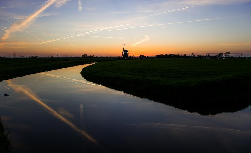 Keywords: sunset dusk dark sky windmill lanscape water grass river