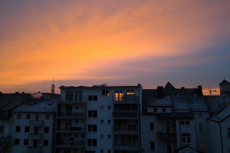 Keywords: sunset evening homes city residential development abendstimmung orange