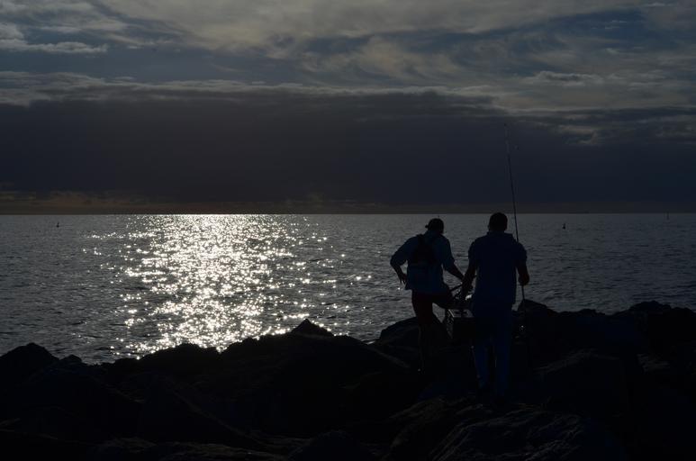 Keywords: sunset fisherman coast silhouette sky water nature fishing sea landscape ocean dusk evening outdoor rod beach