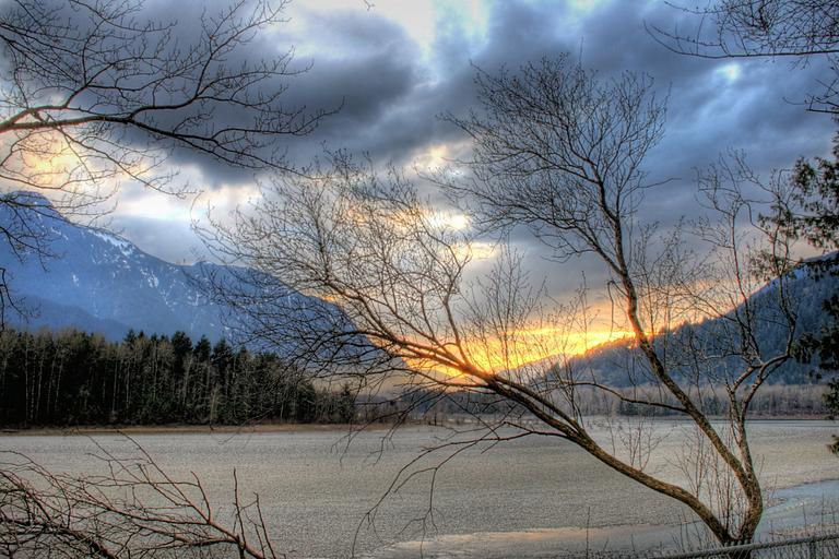 Keywords: sunset landscape sky lake mountain british columbia canada twilight dusk evening trees horizon color outdoors