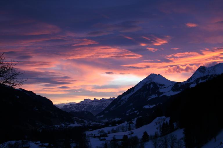Keywords: sunset mountains afterglow evening sky abendstimmung bernese oberland sun sky clouds evening color orange pink purple violet beautiful unique gradient natural spectacle