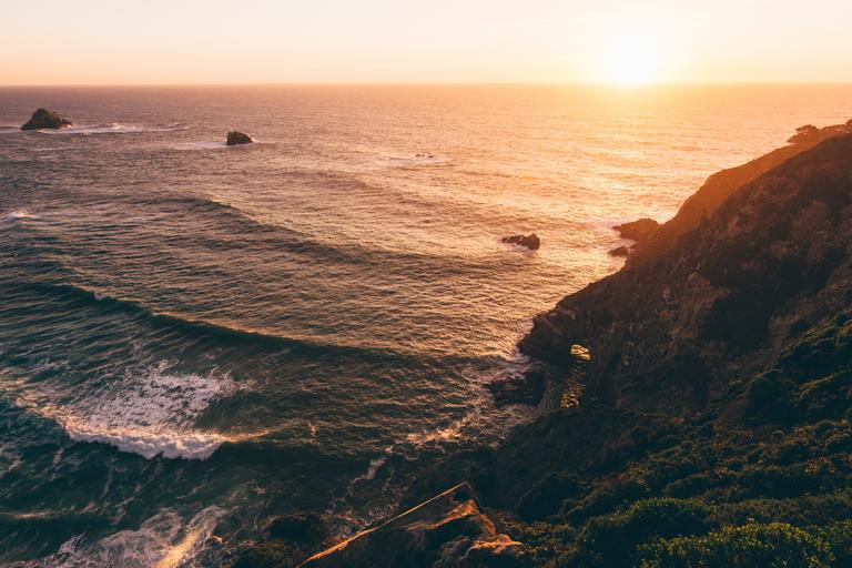 Keywords: sunset ocean waves cliff water orange blue sea sun sky nature coast dusk coastline evening dawn horizon vacation landscape calm tranquil color big sur bixby bridge