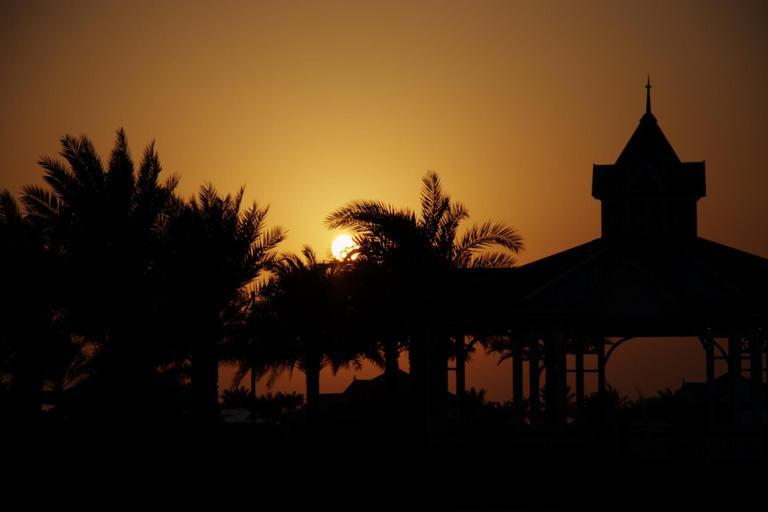 Keywords: sunset pavilion palm trees evening sky beach mood atmosphere