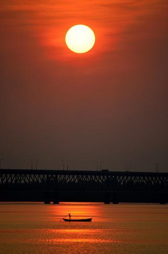 Keywords: sunset red scarlet boat river water bridge crossing evening sun orange sunlight nature atmospheric impressive color intense