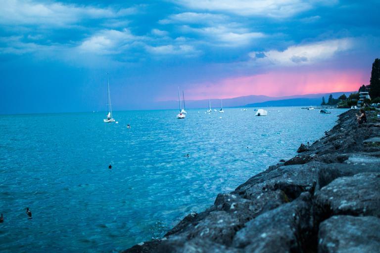 Keywords: sunset sailboats lake water rocks coast horizon sky clouds storm cloudy landscape nature blue