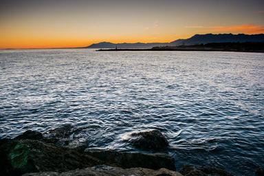 Keywords: sunset sea lighthouse sky sun beach rocks waves orange