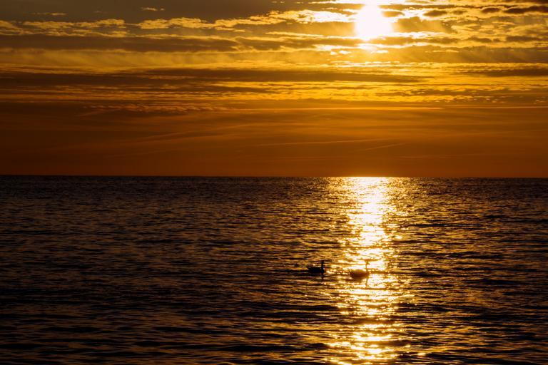 Keywords: sunset sea sun clouds swans orange red yellow rest baltic sea abendstimmung romance background image holiday