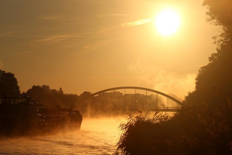 Keywords: sunset sky bridge architecture dusk fog mist trees