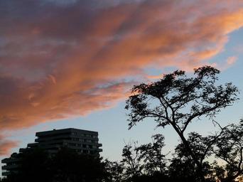 Keywords: sunset sky clouds afterglow city homes tree