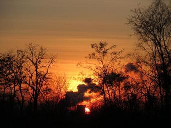 Keywords: sunset steam scene dusk trees silhouettes orange industrial pollution chimney
