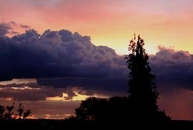 Keywords: sunset sundown clouds cloudbank purple white edges blushing sundown colors glow glimmering light dark horizon tree silhouette