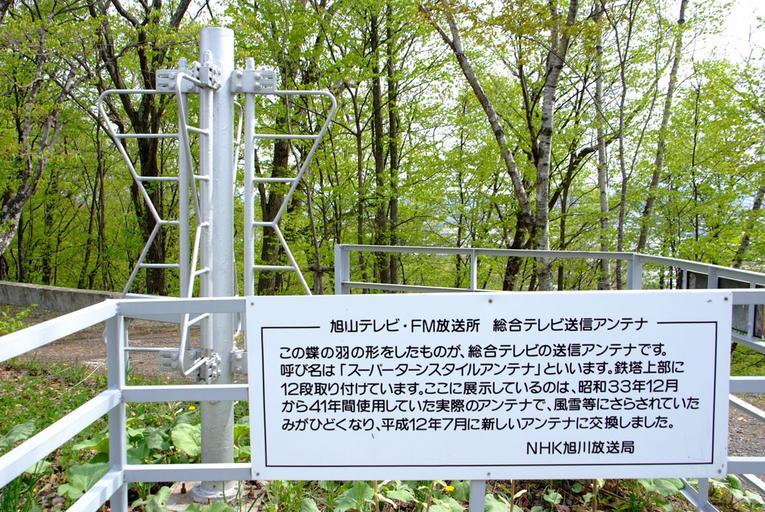 Keywords: Super Turn Style Antenna.jpg en Super turn style antenna exibited at Mt Asahiyama Asahikawa Hokkaido Japan ja スーパーターンスタイルアンテナ 旭山 信 北海道旭 市 Ozizo's file Ozizo 2009-05-16 Television towers in Hokkaido Mount Asahi Asahikawa NHK Asahikawa Broadcasting Station Japanese language signs |