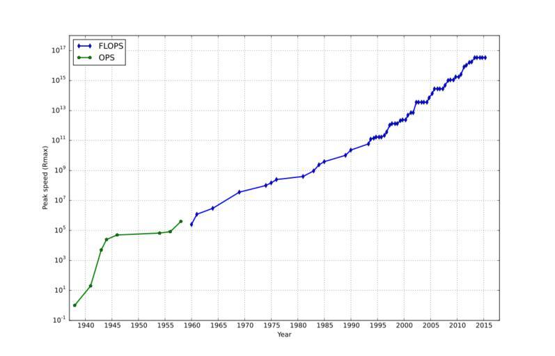 | Keywords: Supercomputing-rmax-graph2.svg en Plot of highest supercomputer performance over time own Morn 2014-05-11 History of computing Supercomputing diagrams Created with Matplotlib Images with Python source code Cc-zero Python source code <source lang python > /usr/bin/env python3 from pylab import use Matplotlib import datetime Data from HTML source at http //top500 org/statistics/perfdevel/ and https //en wikipedia org/w/index php title Supercomputer oldid 380073785 li 1938 1 1941 20 1943 5000 1944 25000 1946 50000 1954 67000 1956 83000 1958 400000 1960 250000 1961 1 2 1964 3 1969 36 1974 100 1975 150 1976 250 1981 400 1983 941 1984 2 4 1985 3 9 1989 10 3 1990 23 2 1993-05-01 59 7 0 42 1128 57 1993-10-01 124 0 47 1493 35 1994-05-01 143 4 0 84 2317 01 1994-10-01 170 1 16 2732 24 1995-05-01 170 1 96 3927 1995-10-01 170 2 49 4784 34 1996-05-01 220 4 3 31 5892 24 1996-10-01 368 2 4 62 7981 24 1997-05-01 1068 7 67 12844 19 1997-10-01 1338 9 51 16898 12 1998-05-01 1338 13 39 22625 14 1998-10-01 1338 17 12 29367 6 1999-05-01 2121 24 7 39062 57 1999-10-01 2379 33 09 50938 56 2000-05-01 2379 43 82 64230 11 2000-10-01 4938 55 3 88082 45 2001-05-01 7226 67 78 108276 78 2001-10-01 7226 94 3 134977 51 2002-05-01 35860 134 3 222263 77 2002-10-01 35860 195 8 291814 16 2003-05-01 35860 241 4 370049 26 2003-10-01 35860 378 6 526740 41 2004-05-01 35860 606 9 812313 21 2004-10-01 70720 840 02 1128834 52 2005-05-01 136800 1166 1694886 64 2005-10-01 280600 1645 7 2299341 68 2006-05-01 280600 2026 2789465 47 2006-10-01 280600 2736 9 3527867 61 2007-05-01 280600 4031 4950600 48 2007-10-01 478200 5937 33 6977593 51 2008-05-01 1026000 8996 78 12152691 08 2008-10-01 1105000 12593 5 17373520 05 2009-05-01 1105000 17110 22640789 57 2009-10-01 1759000 20070 28006450 09 2010-05-01 1759000 24670 32434684 56 2010-10-01 2566000 31124 36 43786881 73 2011-05-01 8162000 40187 29 58930025 84 2011-10-01 10510000 50941 4 74069633 68 2012-05-01 16324751 60824 4 123417786 71 2012-10-01 17590000 76411 162139386 75 2013-05-01 33862700 96619 223654338 13 2013-10-01 33862700 117831 30 250080467 17 2014-05-01 33862700 133700 273763781 09 2014-10-01 33862700 153381 308850512 09 2015-05-01 33862700 164790 72 362652490 36 x1 y1 x2 y2 for line in li splitlines if ' ' not in line continue e line split ' ' if '-' not in e0 m d 1 1 y int e0 else y m d int w for w in e0 split '-' f float e1 if y > 1983 mult 1e9 elif y > 1960 mult 1e6 else mult 1 if y < 1960 y2 append mult f x2 append datetime date y m d else y1 append mult f x1 append datetime date y m d figure figsize 14 9 semilogy x1 y1 label FLOPS lw 2 color blue marker d semilogy x2 y2 label OPS lw 2 color green marker p legend loc upper left xlabel 'Year' ylabel 'Peak speed Rmax ' grid 'on' xticks datetime date y 1 1 for y in range 1935 2040 5 axis datetime date 1937 1 1 datetime date 2018 1 1 1 1e18 savefig Supercomputing-rmax-graph svg show </source> |