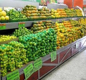 Keywords: supermarket shelves fruits fruit colorful tangerines oranges green yellow music sale eat citrus fruit much south america colombia healthy