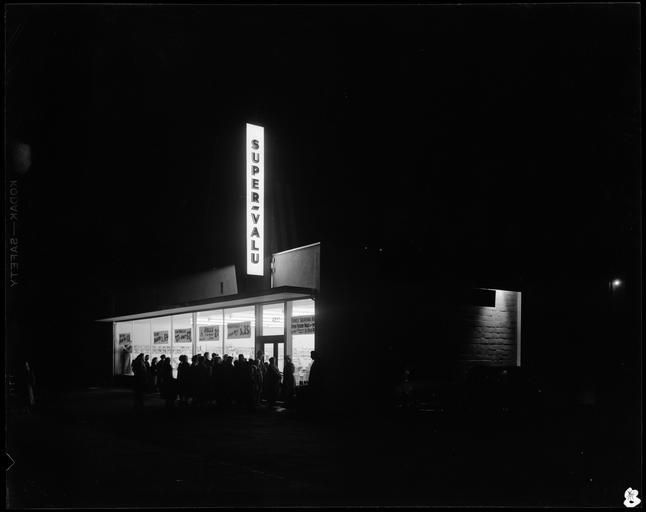 Keywords: vancouver neon blackandwhite monochrome black and white PHOTO NUMBER: 83321F DESCRIPTION: Supervalu Supermarket, East Hastings, Vancouver, BC. PHOTOGRAPHER: Doug Cronk DATE: 1952 SUBJECTS: Supermarkets, Neon More information on our historical photograph collection: www.vpl.ca/historicalphotos PHOTO NUMBER: 83321F DESCRIPTION: Supervalu Supermarket, East Hastings, Vancouver, BC. PHOTOGRAPHER: Doug Cronk DATE: 1952 SUBJECTS: Supermarkets, Neon More information on our historical photograph collection: www.vpl.ca/historicalphotos |