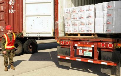 | Keywords: Supply efforts in Jacksonville DVIDS241347.jpg en Marine Staff Sgt Jonathon Thompson inspects cargo from the U S Agency for International Development and the U S Marine Corps at Blount Island Command before loading it aboard the Military Sealift Command maritime prepositioning ship USNS 1st Lt Jack Lummus T-AK-3011 USAID provided more than 120 pallets of relief supplies and 400 bottles of propane The Marine Corps cargo included vehicles and heavy equipment to support the distribution of supplies water production water distribution and fuel distribution The Marines also provided limited earth-moving equipment electrical-producing equipment limited lumber building materials and medical supplies The ship and supplies are bound for Haiti as part of Operation Unified Response following a 7 0 magnitude earthquake near Port-au-Prince Jan 12 2010 2010-01-18 Petty Officer 1st Class Leah Stiles https //www dvidshub net/image/241347 100118-N-+++++-429 2010-01-19 16 38 JACKSONVILLE FL US PD-USGov-Military-Navy United States Agency for International Development Operation Unified Response Images from DoD uploaded by Fæ |