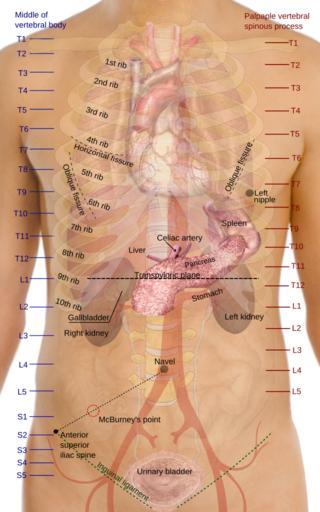 | Keywords: Surface projections of the organs of the trunk.svg trunk using the vertebral column and rib cage as main reference sources found in Superficial anatomy The transpyloric plane and McBurney's point are among the marked locations <P>For reference list and more information see list on main page for the png-version <P>To discuss image please see Talk Human body diagrams All used images are in public domain Mikael Häggström 2010-09-05 thumb left png-format thumb Without labels Human body diagrams Human surface anatomy McBurney's point |