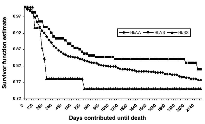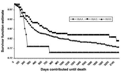 Keywords: Survival Curves for Hemoglobin Genotypes.png en Survival curves of Luo children in an area of Kenya where malaria transmission is intense HbAS Heterozygous sickle-cell hemoglobin; HbAA normal hemoglobin; HbSS homozygous sickle-cell hemoglobin Based on data published in Aidoo et al Lancet 2002 359 1311 Michael Aidoo Michael Aidoo 2010031210054583 Michael Aidoo Sickle-cell anemia |
