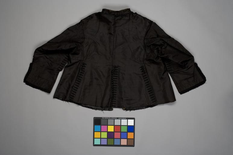 Keywords: Svart tröja i sidenrips med foder i sidenmoiré - Livrustkammaren - 86714.tif LSH artwork sv Tillhört Karl X Gustav 1622-1660 Den stackota jackan har 6 skört d v s fram- och bakstyckena är hela och långa och endast i sidorna har man skarvat in ett svängt skörtstycke ovanför vilket ytterligare ett litet stycke sytts mellan framstyckets utdragna vinge ärmringningen och bakstycketssidosöm Jackan har knapphål hela vägen på vänster framkant d v s det finns 36 st ca 3cm långa knapphål varav de 12 nedersta inte kunnat användas då fodret på detta ställe gårut i kanten Samma antal knappar finns på högra sidan Knapparna är av trä överklädda medsvart tagel som bildar mönstret av en 6-uddig stjärna Stadkanten går fasten delvisbortklippt i framkanterna Ärmarna har sytts vardera av 2 stycken och de är öppna i denfrämre sömmen I den bakre sitter vid uppslagen 2 knapphål Endast en motsvarande knapp finns kvar på vänster ärm medan båda finns kvar på höger Utefter de öppna kanterna sitterpå understycket 21 knapphål 2 5 cm långa och sydda med svart högertvinnat silke 6stygn/cm Till dessa finns på vänster ärms överstycke 17 knappar i behåll och på höger 16st Men 4 knappar ser ut att saknas på båda ärmarna <br/>Vänster framstyckes bakre skörtkant har 19 3 cm långa knapphål och lika många knapparfinns på sidoskörtets främre del dock kan bara de 3 översta knäppas då fodret täcker påinsidan de övriga knapphålen På sidoskörtets bakre kant sitter 17 knappar svarande mot de17 knapphålen i bakstyckets främre sidokant Här kan också endast de 3 översta knäppas Mitt bak finns på vänster stycke 18 knappar till samma antal knapphål varav de 2 överstakan knäppas På den främre kanten av detta skört sitter 17 knapphål passande till likamånga knappar på högra sidostyckets kant de 3 översta kan knäppas På främre kanten avsidostycket sitter 19 knappar passande till samma antal knapphål i högra framstyckets bakresida varav de 2 översta kan knäppas Kragen är sydd av 2 snedskurna bitar av tyget som sytts ihop ungefär mitt bak Dess längdupptill är 51 cm nertill vid fastsyningen 53 cm Den är mitt fram 4 5 cm hög och har 2något mindre knappar av annan utformning än de övriga i plagget samt 2 tränsar av svartsilke Mitt bak är kragen knappt 3 5 cm hög I kragen ligger grov mörkbrun kanfas 13x12tr/cm2 som styvnad Jackan har på högra bakstycket en platt slät knapp placerad 1 5 cmfrån axelsömmen och 5 cm från kragsömmen Den är 1 5 cm i diameter och klädd med svart taft på trästomme Den har med största sannolikhet tjänat som fäste för kappbandet Jackan harett mellanfoder av grov grå linnelärft 16x16 tr/cm2 dock ej i ärmarna I dessa troligenmellanfoder endast nertill vid ärmuppslagen Dess innerfoder utgörs av svart moiré Vådbredden är minst ca 64 cm ty man kan ej härskönja spår av veck från moirébehandlingen Då vecket torde legat mitt i tyget har man häralltså klarat sig med mindre än den förmodade halva tygbredden ca 33 á 34 cm 40x26tr/cm2 Stad 0 6 cm 8 gula 4 röda 4 gula 4 röda 8 gula 1 svart tråd tuskaftsbindning Inga spår efter hängslen syns - märkligt nog - i jackan Detta kan beropå att dess foder som helhet är mycket defekt delvis söndersprättat och trasigt Jackan ärgarnerad med en 4 5 cm bred svart knypplad spets av lingarn i ett mycket smått ochhopträngt mönster Den sitter i 2 rader utefter den raka nederkanten - utan pie - påinsidan av ärmarna för att bilda de eleganta uppslagen Spetsen har sytts på så att den ihela uppslaget sidorna och nederkanten går i en veckad kant som når ca 2 cm utanförärmen Varje veck drar ca 3 ½ gång av materialet I själva den raka nederkantens del har man ovanför kantspetsen lagt en rad spets nu nästanslät blott en aning löst rynkad Beräknad spetsåtgång till en ärm ca 3 meter Ärmarna ärhopsydda så att överärmstycket lagts ovanpå underärmsstycket Innan ärmarna sytts i harärmhålen kantats med passpoal Mitt bak har höger stycke lagts på vänster och i sidorna harbakstyckena lagts på de främre Höger ärm hade lossnat helt men efter fotografering syttsfast 1955 original caption Svart tröja i sidenrips med foder i sidenmoiré LRK 19023<br/> Nyckelord Sidenrips Karl X Gustav Tröja Jacka 1600-tal Föremålsbild Dräkt - 1654 1660 silk Färg svart d1 - dräkt - yttermaterial material siden - silk Färg svart d2 - dräkt - foder material siden size mm 600 mitt fram size mm 580 mitt fram size mm 650 rygg mitt bak size mm 430 rygg size mm 340 skört fram size mm 320 skört sida size mm 290 skört bak size mm 150 axel size mm 590 ärm size mm 490 ärm size mm 395 ärm nedtill size mm 330 ärmslits från ärmhål och nedåt size mm 170 sprund i ärmens nedkant LRK Karl X Gustav av Sverige place of origin original filename lm_dig6516_19023 55558 inventory number LRK 19023 86714 CC-BY-SA Matti Östling <gallery caption Different images of same object > File Svart tröja i sidenrips med foder i sidenmoiré - Livrustkammaren - 86715 tif File Jacka av svart sidenrips - Livrustkammaren - 78654 tif </gallery> Matti Östling Charles X Gustav of Sweden Sweaters Jackets Clothing in Livrustkammaren Shirts Media contributed by LSH unmatched material Media contributed by LSH dim-with multiple size templates Media contributed by LSH unmatched keyword Color images from Livrustkammaren Media contributed by LSH 2013-10 |