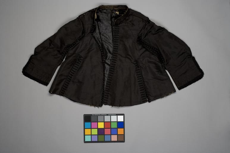 Keywords: Svart tröja i sidenrips med foder i sidenmoiré - Livrustkammaren - 86715.tif LSH artwork sv Tillhört Karl X Gustav 1622-1660 Den stackota jackan har 6 skört d v s fram- och bakstyckena är hela och långa och endast i sidorna har man skarvat in ett svängt skörtstycke ovanför vilket ytterligare ett litet stycke sytts mellan framstyckets utdragna vinge ärmringningen och bakstycketssidosöm Jackan har knapphål hela vägen på vänster framkant d v s det finns 36 st ca 3cm långa knapphål varav de 12 nedersta inte kunnat användas då fodret på detta ställe gårut i kanten Samma antal knappar finns på högra sidan Knapparna är av trä överklädda medsvart tagel som bildar mönstret av en 6-uddig stjärna Stadkanten går fasten delvisbortklippt i framkanterna Ärmarna har sytts vardera av 2 stycken och de är öppna i denfrämre sömmen I den bakre sitter vid uppslagen 2 knapphål Endast en motsvarande knapp finns kvar på vänster ärm medan båda finns kvar på höger Utefter de öppna kanterna sitterpå understycket 21 knapphål 2 5 cm långa och sydda med svart högertvinnat silke 6stygn/cm Till dessa finns på vänster ärms överstycke 17 knappar i behåll och på höger 16st Men 4 knappar ser ut att saknas på båda ärmarna <br/>Vänster framstyckes bakre skörtkant har 19 3 cm långa knapphål och lika många knapparfinns på sidoskörtets främre del dock kan bara de 3 översta knäppas då fodret täcker påinsidan de övriga knapphålen På sidoskörtets bakre kant sitter 17 knappar svarande mot de17 knapphålen i bakstyckets främre sidokant Här kan också endast de 3 översta knäppas Mitt bak finns på vänster stycke 18 knappar till samma antal knapphål varav de 2 överstakan knäppas På den främre kanten av detta skört sitter 17 knapphål passande till likamånga knappar på högra sidostyckets kant de 3 översta kan knäppas På främre kanten avsidostycket sitter 19 knappar passande till samma antal knapphål i högra framstyckets bakresida varav de 2 översta kan knäppas Kragen är sydd av 2 snedskurna bitar av tyget som sytts ihop ungefär mitt bak Dess längdupptill är 51 cm nertill vid fastsyningen 53 cm Den är mitt fram 4 5 cm hög och har 2något mindre knappar av annan utformning än de övriga i plagget samt 2 tränsar av svartsilke Mitt bak är kragen knappt 3 5 cm hög I kragen ligger grov mörkbrun kanfas 13x12tr/cm2 som styvnad Jackan har på högra bakstycket en platt slät knapp placerad 1 5 cmfrån axelsömmen och 5 cm från kragsömmen Den är 1 5 cm i diameter och klädd med svart taft på trästomme Den har med största sannolikhet tjänat som fäste för kappbandet Jackan harett mellanfoder av grov grå linnelärft 16x16 tr/cm2 dock ej i ärmarna I dessa troligenmellanfoder endast nertill vid ärmuppslagen Dess innerfoder utgörs av svart moiré Vådbredden är minst ca 64 cm ty man kan ej härskönja spår av veck från moirébehandlingen Då vecket torde legat mitt i tyget har man häralltså klarat sig med mindre än den förmodade halva tygbredden ca 33 á 34 cm 40x26tr/cm2 Stad 0 6 cm 8 gula 4 röda 4 gula 4 röda 8 gula 1 svart tråd tuskaftsbindning Inga spår efter hängslen syns - märkligt nog - i jackan Detta kan beropå att dess foder som helhet är mycket defekt delvis söndersprättat och trasigt Jackan ärgarnerad med en 4 5 cm bred svart knypplad spets av lingarn i ett mycket smått ochhopträngt mönster Den sitter i 2 rader utefter den raka nederkanten - utan pie - påinsidan av ärmarna för att bilda de eleganta uppslagen Spetsen har sytts på så att den ihela uppslaget sidorna och nederkanten går i en veckad kant som når ca 2 cm utanförärmen Varje veck drar ca 3 ½ gång av materialet I själva den raka nederkantens del har man ovanför kantspetsen lagt en rad spets nu nästanslät blott en aning löst rynkad Beräknad spetsåtgång till en ärm ca 3 meter Ärmarna ärhopsydda så att överärmstycket lagts ovanpå underärmsstycket Innan ärmarna sytts i harärmhålen kantats med passpoal Mitt bak har höger stycke lagts på vänster och i sidorna harbakstyckena lagts på de främre Höger ärm hade lossnat helt men efter fotografering syttsfast 1955 original caption Svart tröja i sidenrips med foder i sidenmoiré LRK 19023<br/> Nyckelord Karl X Gustav Tröja Jacka Svarta Siden 1600-tal Dräkt Föremålsbild - 1654 1660 silk Färg svart d1 - dräkt - yttermaterial material siden - silk Färg svart d2 - dräkt - foder material siden size mm 600 mitt fram size mm 580 mitt fram size mm 650 rygg mitt bak size mm 430 rygg size mm 340 skört fram size mm 320 skört sida size mm 290 skört bak size mm 150 axel size mm 590 ärm size mm 490 ärm size mm 395 ärm nedtill size mm 330 ärmslits från ärmhål och nedåt size mm 170 sprund i ärmens nedkant LRK Karl X Gustav av Sverige place of origin original filename lm_dig6517_19023 55558 inventory number LRK 19023 86715 CC-BY-SA Matti Östling <gallery caption Different images of same object > File Jacka av svart sidenrips - Livrustkammaren - 78654 tif File Svart tröja i sidenrips med foder i sidenmoiré - Livrustkammaren - 86714 tif </gallery> Matti Östling Charles X Gustav of Sweden Sweaters Jackets Silk clothing Clothing in Livrustkammaren Shirts Media contributed by LSH unmatched material Media contributed by LSH dim-with multiple size templates Media contributed by LSH unmatched keyword Color images from Livrustkammaren Media contributed by LSH 2013-10 |