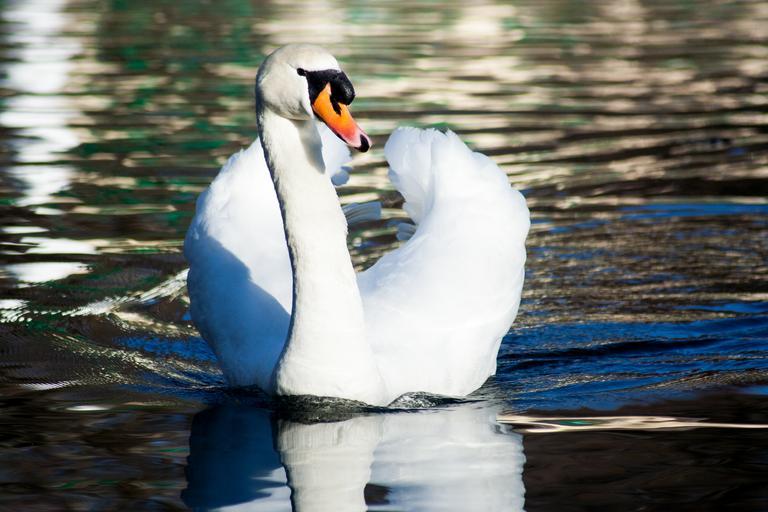 Keywords: swan bird water pond swim beautiful white graceful nature animal bill wing lake wild elegant plumage romantic love summer light sun luck sunshine happy joy