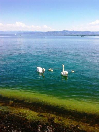 Keywords: swans swan family animal water waters bird birds lake white pride nature blue lake constance switzerland landscape background romanshorn sky