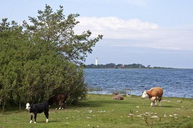 Keywords: sweden landscape sea ocean bay water cattle field trees nature outside sky clouds summer spring rural country countryside lighthouse