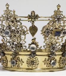 Keywords: Swedish - Swedish Wedding Crown - Walters 572047 - Detail B.jpg Although crowns are customarily associated with royalty wedding crowns in Scandinavia were worn by brides of all social strata They were owned by the bride's parish and loaned for the occasaion Wedding crowns were richly decorated with emblems of conjugal love this example includes carnations associated with enduring marriage because their fragrance outlasts their blossoms dangling linden leaves which represent fertility in Nordic literature and angels Christian figures that allude to the eternal and spiritual qualities of marriage The crown itself resembles that worn by Mary Queen of Heaven early Other date century 18 silver gilt with paste jewels cm 14 9 accession number 57 2047 17336 Ruth Blumka New York November 1978 mode of acquisition unknown Walters Art Museum 1978 by purchase Museum purchase 1978 Jewelry - Ancient to Modern The Walters Art Gallery Baltimore 1979-1980 Objects of Adornment Five Thousand Years of Jewelry from the Walters Art Gallery Baltimore Cooper-Hewitt National Design Museum New York; Chrysler Museum of Art Norfolk; Carnegie Museum of Art Pittsburgh; San Antonio Museum of Art San Antonio; Philbrook Museum of Art Tulsa; Honolulu Academy of Arts Honolulu; New Orleans Museum of Art New Orleans; Milwaukee Art Museum Milwaukee; Minneapolis Institute of Arts Minneapolis; Toledo Museum of Art Toledo; The John and Mable Ringling Museum of Art Sarasota 1984-1987 Jewelry from the Walters Art Museum and the Zucker Family Collection The Walters Art Gallery Baltimore 1987 Bedazzled 5 000 Years of Jewelry from the Walters Art Museum Frist Center for the Visual Arts Nashville; The John and Mable Ringling Museum of Art Sarasota; The Walters Art Museum Baltimore 2006-2009 Bedazzled 5 000 Years of Jewelry El Paso Museum of Art El Paso 2010 place of origin Sweden Walters Art Museum license Jewellery in the Walters Art Museum Art of Sweden Media contributed by the Walters Art Museum needs category review Bridal crowns |
