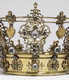 Keywords: Swedish - Swedish Wedding Crown - Walters 572047 - Detail C.jpg Although crowns are customarily associated with royalty wedding crowns in Scandinavia were worn by brides of all social strata They were owned by the bride's parish and loaned for the occasaion Wedding crowns were richly decorated with emblems of conjugal love this example includes carnations associated with enduring marriage because their fragrance outlasts their blossoms dangling linden leaves which represent fertility in Nordic literature and angels Christian figures that allude to the eternal and spiritual qualities of marriage The crown itself resembles that worn by Mary Queen of Heaven early Other date century 18 silver gilt with paste jewels cm 14 9 accession number 57 2047 17336 Ruth Blumka New York November 1978 mode of acquisition unknown Walters Art Museum 1978 by purchase Museum purchase 1978 Jewelry - Ancient to Modern The Walters Art Gallery Baltimore 1979-1980 Objects of Adornment Five Thousand Years of Jewelry from the Walters Art Gallery Baltimore Cooper-Hewitt National Design Museum New York; Chrysler Museum of Art Norfolk; Carnegie Museum of Art Pittsburgh; San Antonio Museum of Art San Antonio; Philbrook Museum of Art Tulsa; Honolulu Academy of Arts Honolulu; New Orleans Museum of Art New Orleans; Milwaukee Art Museum Milwaukee; Minneapolis Institute of Arts Minneapolis; Toledo Museum of Art Toledo; The John and Mable Ringling Museum of Art Sarasota 1984-1987 Jewelry from the Walters Art Museum and the Zucker Family Collection The Walters Art Gallery Baltimore 1987 Bedazzled 5 000 Years of Jewelry from the Walters Art Museum Frist Center for the Visual Arts Nashville; The John and Mable Ringling Museum of Art Sarasota; The Walters Art Museum Baltimore 2006-2009 Bedazzled 5 000 Years of Jewelry El Paso Museum of Art El Paso 2010 place of origin Sweden Walters Art Museum license Jewellery in the Walters Art Museum Art of Sweden Media contributed by the Walters Art Museum needs category review Bridal crowns |