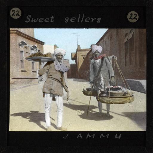 | Keywords: Sweet Sellers, Jammu, ca.1875-ca.1940 (imp-cswc-GB-237-CSWC47-LS10-022).jpg en <br> Sweet Sellers Jammu ca 1875-ca 1940 Photograph of two men selling sweets in the city of Jammu One man is carrying two baskets over his shoulders and the other is holding a large tray full of produce There are red brick buildings in the background ; This belongs to a series of Church of Scotland Foreign Missions Committee lantern slides relating to Jammu City which is also known as the City of Temples A mission station occupied by Church of Scotland missionaries was founded here in the late 19th/early 20th century Jammu is also one of the three administrative divisions within Jammu and Kashmir the northernmost state in India Photographer Unknown Filename imp-cswc-GB-237-CSWC47-LS10-022 tif Coverage date 1875/1940 Part of collection International Mission Photography Archive ca 1860-ca 1960 Geographic subject region Jammu and Kashmir Type images Part of subcollection Photographs from the Centre for the Study of World Christianity University of Edinburgh U K ca 1900-ca 1940s Repository name Centre for the Study of World Christianity Archival file impaunpub_Volume7/1738 url Repository address The University of Edinburgh School of Divinity New College Mound Place Edinburgh EH1 2LX United Kingdom Geographic subject country India Format aacr2 1 lantern slide 8 x 8 cm Geographic subject continent Asia Rights Contact the repository for details Part of series In the Temple City of Jammu LS10 Repository email divinity-CSWC ed ac uk Subject lcsh Keyword Marketplaces; Local foods Date created 1875/1940 Publisher of the digital version University of Southern California Libraries Subject aat genre group portraits Format aat lantern slides Legacy record ID impa-m69246 Access conditions http //www ed ac uk/schools-departments/divinity/research/centres/world-christianity/collections-resources File GB 237 CSWC47/LS10/22 1875/1940 author http //digitallibrary usc edu/cdm/ref/collection/p15799coll123/id/64856 PD-old-70-1923 Magic lantern images Images from USC Digital Library uploaded by Fæ International Mission Photography Archive ca 1860-ca 1960 Jammu Carrying poles |
