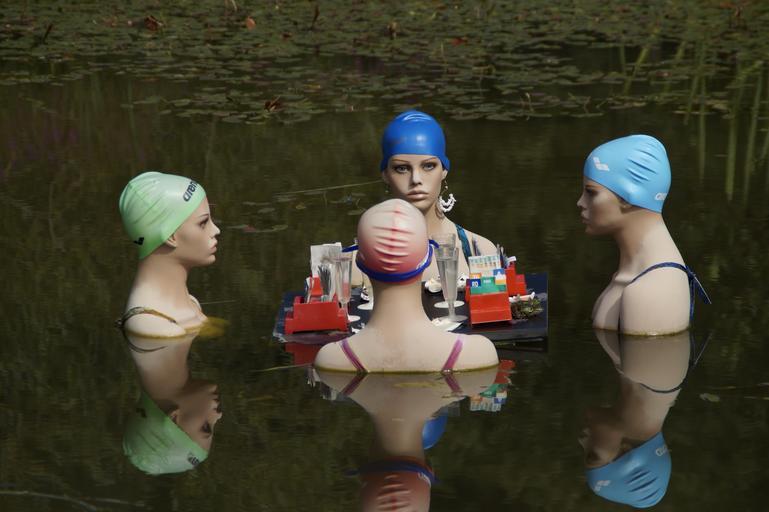 Keywords: swim swimmers water pond lake swim cap women female dolls art art object botanical garden ulm mirroring waters bathing mermaids mermaids mermaid meeting talk chat group four