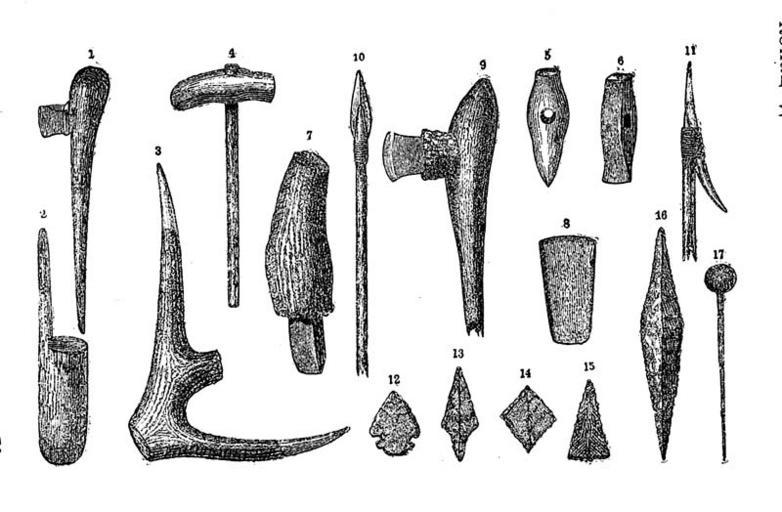 Keywords: Swiss stone tools.jpg Сл 35 Сп аве швајца ских језе аца каменога доба 1 камена секи а у д вено д жаљo углављена 2 маљ д вени 3 будак од јеленског ога 4 5 6 камени батови 7 длето 8 секи а 9 б адва 10 копље 11 коштана ст ела 12 до 16 ов шци камених ст ела 17 коштана игла Project Rastko Kameno doba