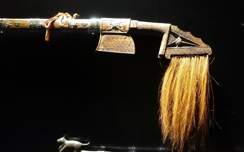 Keywords: Sword, East Timor, 1968-1970, buffalo horn, wood, iron, silver, horse mane - Museu do Oriente - Lisbon, Portugal - DSC06855.JPG en Exhibit in the Museu do Oriente - Lisbon Portugal This work is old enough so that it is in the public domain Photography was permitted in the museum without restriction 2014-10-05 own Daderot other versions cc-zero Arts and Crafts of East Timor in the Museu do Oriente Uploaded with UploadWizard Suriks |