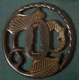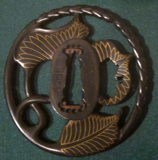 Keywords: Sword guard (tsuba) with hollyhock leaves and stems signed Masasada.JPG Sword guard tsuba with hollyhock leaves and stems signed Masasada early-19th century Japan shakudō and gold own photo2013 Haa900 Tsuba made with shakudō Alcea rosea in art Cc-zero |