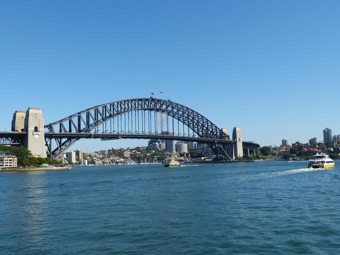 Keywords: sydney port australia bridge boats water booked transport connection harbour bridge tourism traffic city arch pillar