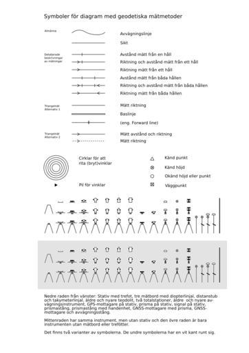 | Keywords: Symboler för diagram med geodetiska mätmetoder (sv).svg sv Symboler för användning i diagram som beskriver geodetiska mätmetoder Innehåller punkt- och linjesymboler och symboler för diopterlinjal distanstub och takymeterlinjal på mätbord teodoliter totalstationer ett prisma en signal en avvägningsstång och ett avvägningsinstrument Symbolerna med utrustning finns även med en vit kant runtom i filen OBS Instrumentsymbolerna följer ingen standard och punkt- och linjesymbolerna är de som är vanligt förekommande i geodesiundervisningen i Sverige Own Johan Gustafsson 2009-06-26 KJG2007 Survey methods diagram symbols svg The same contents but in English Created with Inkscape yes Survey method diagrams Diagram legends |