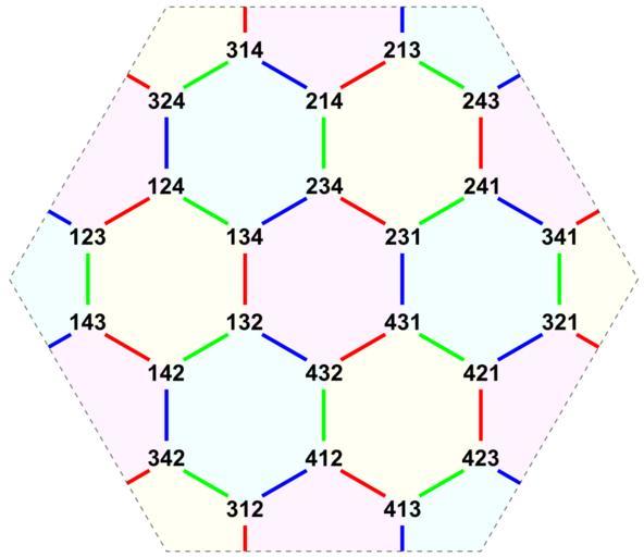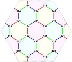 Keywords: Symmetric group 4; Cayley graph 1,5,21 (Nauru torus).svg Cayley graph of S<sub>4</sub> generated by blue 12 green 13 red 14 This is a Nauru graph compare http //11011110 livejournal com/124705 html The many faces of the Nauru graph by 0xDE The permutations of four elements 1 2 3 4 are represented by sequences like in this file but with the first digit omitted Reflected triples are centrally symmetric to each other in this arrangement Referring to the structure itself a torus tiled with twelve hexagons four of each color this means that reflected triples are on opposite sides of magenta hexagons The following equation of permutation compositions corresponds to that fact <br> 14 ˆ˜ 12 ˆ˜ 14 12 ˆ˜ 14 ˆ˜ 12 24 Triples linked by an edge differ in only one digit <br> The left one when the edge is blue;<br> the middle one when it's green;<br> the right one when it's red derivate work of File Nauru graph torus svg User Lipedia 300px300px Nauru graph Honeycomb patterns Torus Order-3 hexagonal tiling |