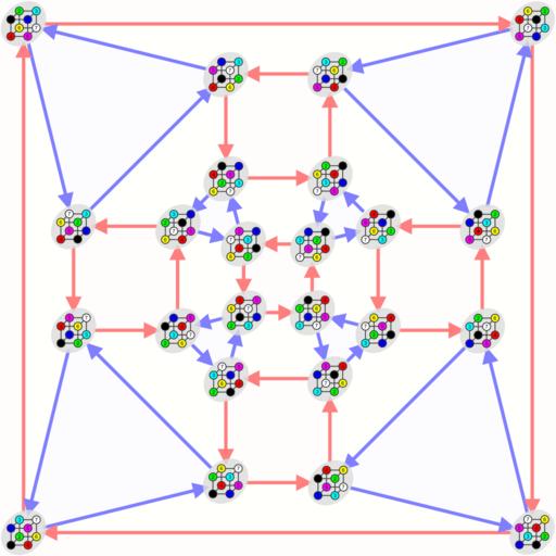 Keywords: Symmetric group 4; Cayley graph 4,9; octal cubes.svg Cayley graph of S<sub>4</sub> showing all rotations of a cube The colors are the vertices of the RGB color cube 80px and correspond to the numbers 0 to 7 80px Red arrows stand for permutation number 9 rotating the cube to the right around the front facing face Blue arrows stand for permutation number 4 rotating the cube to the left around the topmost and bottommost vertex GrapheCayley-S4-Plan svg 2016 GrapheCayley-S4-Plan svg Fool talk derivative work Watchduck <span class signature-talk >talk</span> 200px Symmetric group 4; Cayley graph 4 9; Schlegel Full octahedral group; subgroups; S4 Color cubes |