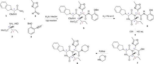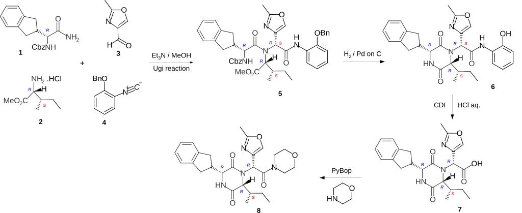 Keywords: Synthesis of Retosiban.svg en A synthetic scheme for the production of Retosiban via the Ugi reaction 2016-02-22 own Alandb other versions cc-zero Drug syntheses Retosiban