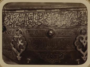 | Keywords: Syr-Darya Oblast. City of Turkestan. Mosque of Saint Sultan Akhmed Iassavi. Continuation of Engraved Inscription Stating that the Bronze was Donated by Emir Timur Kuragan WDL3591.png Artwork ru Богаевский иколай Владими ович 1843 1912 гг fr Bogaevskii Nikolaï V 1843-1912 en Bogaevskii Nikolai V 1843-1912 zh 亚历山大·L· ,1840-1888 年 pt Bogaevskii Nikolai V 1843-1912 ar بوغافسكي، نيكولاي ف ، 1843-1912 es Bogaevskii Nikolai V 1843-1912 ru Сы да ьинская область Го од Ту кестан ечеть святого Султана Ахмеда Ясави П одолжение выг ави ованной надписи сообщающей что б онза была поже твована эми ом Тиму ом Ку аганом fr Oblast de Syr-Darya Ville de Turkestan Mosquée du vénérable sultan Akhmed Iassavi Suite de l'inscription gravée indiquant que le bronze fut donné par l'émir Timour Kuragan en Syr-Darya Oblast City of Turkestan Mosque of Saint Sultan Akhmed Iassavi Continuation of Engraved Inscription Stating that the Bronze was Donated by Emir Timur Kuragan zh 锡尔河 区 其斯 市 苏尔 ·艾哈迈德·亚萨维清 寺 器雕刻铭文的延续部分,铭文指明此器由埃米尔帖 儿·库拉甘捐赠 pt Oblast de Sir Dária Cidade do Turquestão Mesquita do santo sultão Ahmed Iassavi Parte de uma inscrição gravada declarando que a peça em bronze foi doada pelo Emir Timur Kuragan ar منطقة سير داريا مدينة تُرْكِستان مسجد الولي سلطان أحمد يسوي تكملة لنقش محفور يوضح أن هذه القطعة البرونزية هبة من الأمير تيمور كوراغان ru Эта фотог афия элемента итуальной чаши для воды внут и мавзолея Ходжи Ахмеда Ясави в Яси сов еменный Ту кестан Казахстан соде жится в а хеологической части <em> Ту кестанского альбома </em> Шеститомное фотог афическое исследование было подготовлено и издано в 1871 1872 гг под пат онажем гене ала Константина П фон Кауфмана пе вого гене ал-губе нато а 1867 1882 гг Ту кестана как называли в то в емя те ито ию Цент альной Азии п инадлежавшую Российской импе ии Яси ассоции уется с суфийским мистиком Ходжой Ахмедом Ясави 1103 1066 гг великая слава кото ого побудила Тиму а Таме лана пост оить мемо иальную г обницу <em>ханаку</em> на месте его захо онения авзолею пост оенному в 1396 1398 гг п исущи ха акте ные че ты тиму идской а хитекту ы в то в емя пе еживавшей свой асцвет в Сама канде а снимке видна часть большой б онзовой итуальной чаши для воды; в надписи на чаше указано что она была поже твована Тиму ом Чаша ук ашена изысканными ботаническими фигу ами и пе сидско-а абскими надписями аве ху находится п одолжение полосы с надписью выполненной письмом насх и пе еплетающейся с узо ом из завитков Под полосой видны деко ативные б онзовые элементы и еще две полосы с надписями угловатыми буквами а езной пове хности в нижней части фотог афии видна а абеска Высота чаши составляет около одного мет а <br>Котлы; адписи; Ясави Ахмед уме в 1166 г ; Фотог афические исследования; П едметы елигиозного назначения; огильные памятники; Г обницы fr Cette photographie d'un détail du bassin dédié aux ablutions rituelles du mausolée de Khodzha Akhmed Iassavi à Yasi au Turkestan actuel Kazakhstan est extraite de l'ouvrage archéologique <em>Album du Turkestan</em> Cet inventaire photographique en six volumes fut réalisé entre 1871 et 1872 sous le patronage du général Konstantin P von Kaufman premier gouverneur général 1867-1882 du Turkestan nom donné aux territoires d'Asie centrale de l'Empire russe La ville de Yasi est associée au mystique soufi Khodzha Akhmed Iassavi 1103-1166 dont la renommée était telle que Tamerlan fit construire un sanctuaire commémoratif <em>khanaka</em> sur le site de sa tombe Bâti de 1396 à 1398 le mausolée présente les caractéristiques de l'architecture timuride en pleine apogée à Samarcande à cette époque Cette vue partielle du grand bassin dédié aux ablutions rituelles montre l'inscription indiquant qu'il fut donné par Tamerlan Le bassin est richement décoré de figures à fleurs et d'inscriptions perso-arabes Dans la partie supérieure de la photographie la suite d'une bande d'inscription en écriture naskhi entrelacée de motifs de vrilles apparaît Des armatures décoratives en bronze et deux autres bandes d'inscription avec des lettres angulaires sont visibles sous cette bande Au bas de la photographie la surface bombée est ornée d'une arabesque Le bassin mesure environ un mètre de hauteur <br>Chaudrons; Inscriptions; I͡Asavi Akhmed mort en 1166; Inventaires photographiques; Articles religieux; Monuments funéraires; Tombes en This photograph of a detail of a ritual basin in the interior of the mausoleum of Khodzh